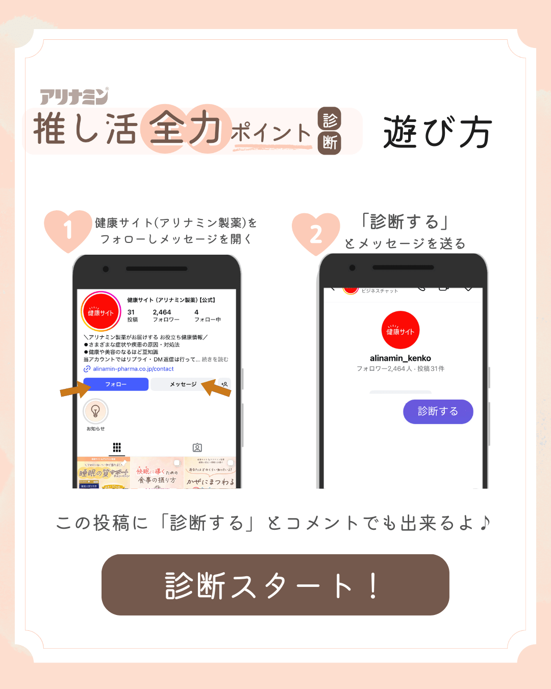 - ①健康サイト(アリナミン製薬)公式インスタグラム(@alinamin_kenko)をフォロー