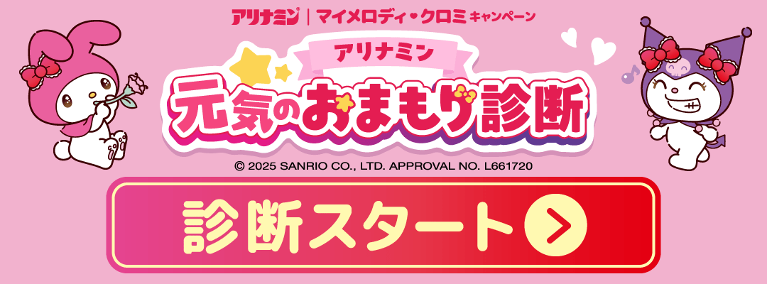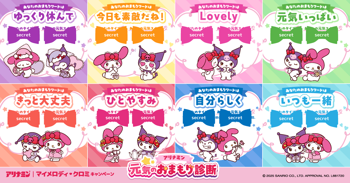 診断結果は可愛いマイメロディ♡クロミのイラストとともに、あなたの『おまもりワード』『おすすめのアリナミン商品』をご紹介♡