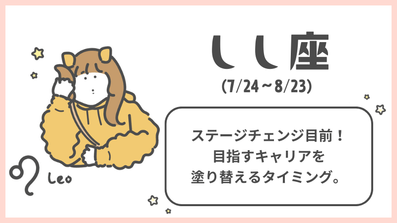 約7年前から、「自分らしい働き方」や「キャリアの目標」、「目指す場所」を模索してきたしし座さんも多いことでしょう。 今月8日を境に、長く続いていたそのテーマが、いよいよ最終章に入ります。「もう古い」「合わない」と感じていたことがあれば、この時期に自然と一区切りがつき、新たな道が見えてくるはず。