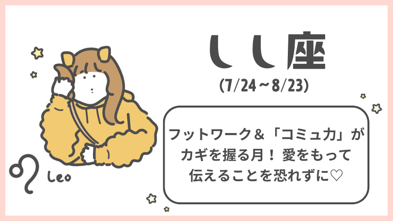 今月のしし座さんは「会話」がカギとなるので、心を開いて話すことで、落ち着いた対応を。気持ちを溜め込まず、誰かとシェアすることで、風通しのよい運気を作っていきましょう♪