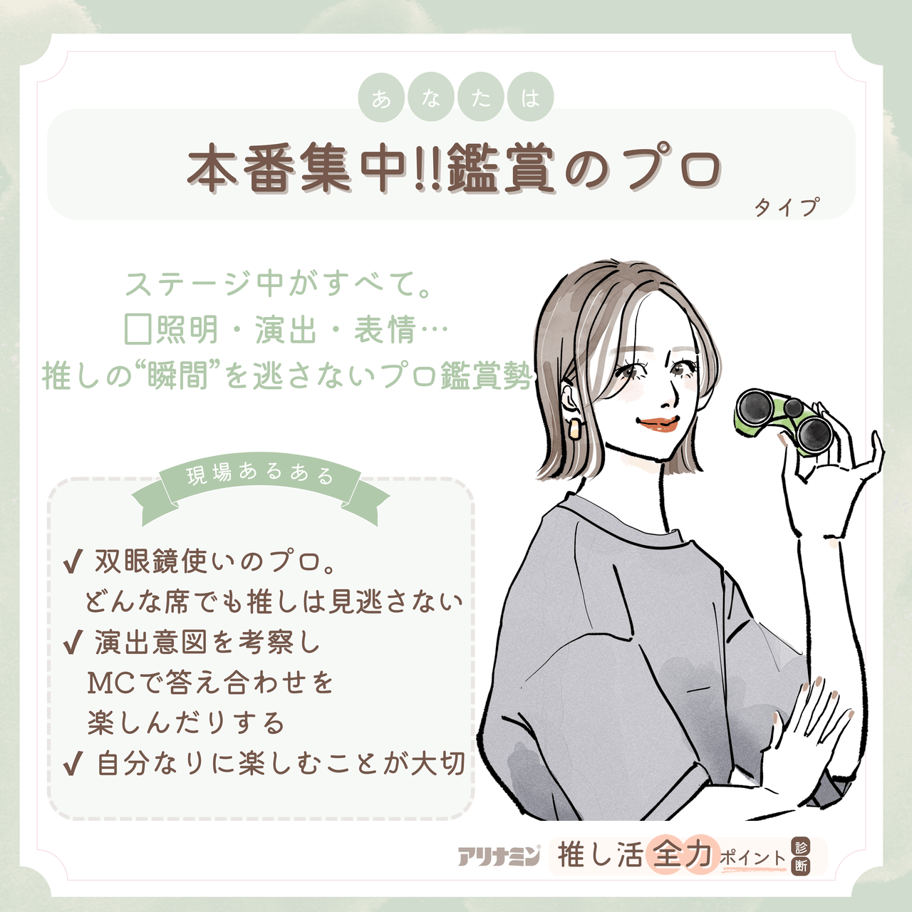 【あなたは現場でどのタイプ?推し活全力ポイント診断♡】あなたは…『本番集中!!鑑賞のプロタイプ』