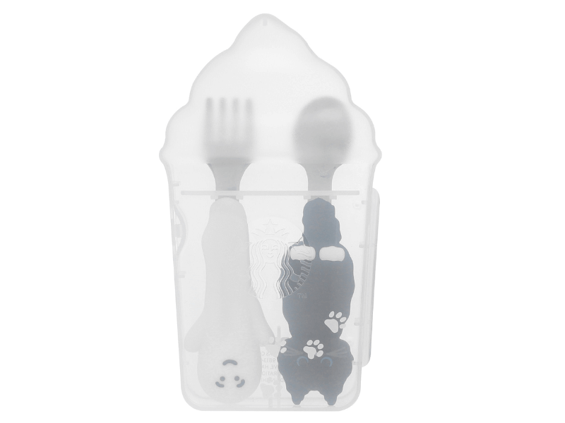 黒猫のスプーンとゴーストのフォークがセット。フラペチーノ型ケースに猫の足跡が隠れてるのも◎