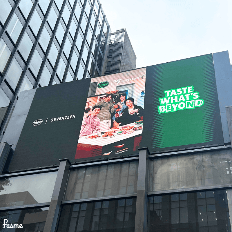 そのすぐそばのビル上部には、SEVENTEENメンバーが登場する大型LEDビジョン広告が流れていて、街の中でも一気にテンションが上がる演出に♡