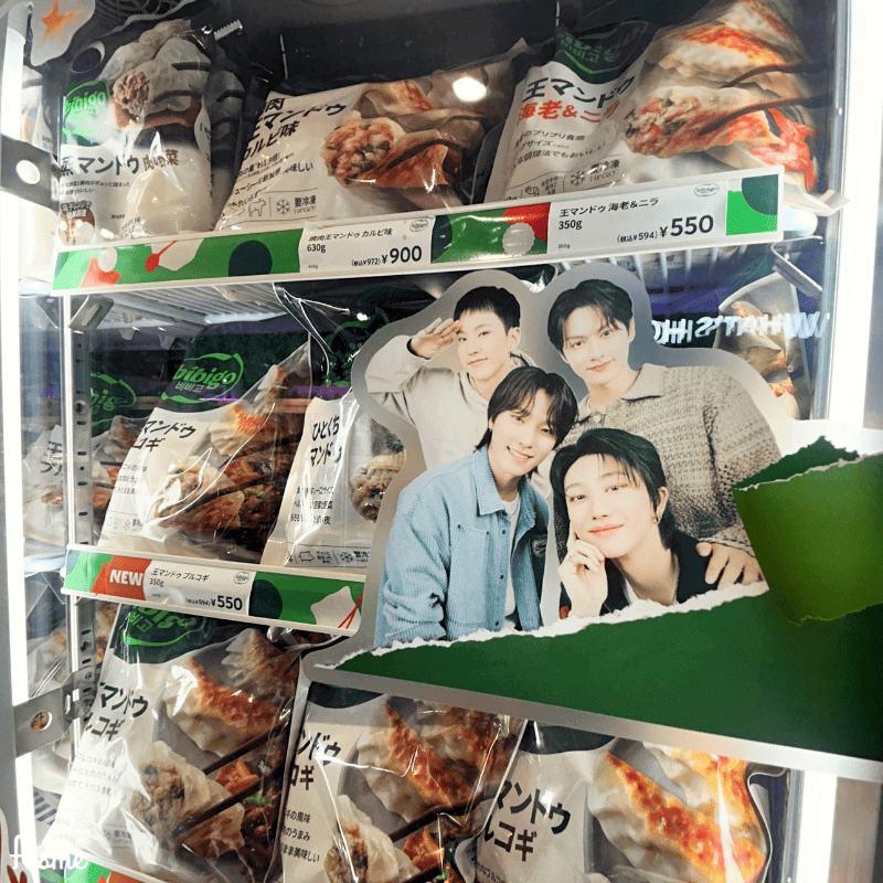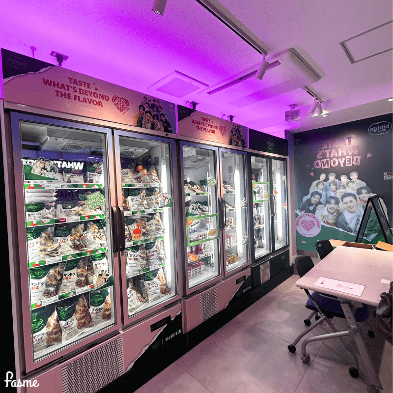 bibigoの冷凍食品がずらりと並ぶこのゾーンでは、ガラス扉にSEVENTEENメンバーのビジュアルが貼られていて、まるで一緒にお買い物しているような気分に♡