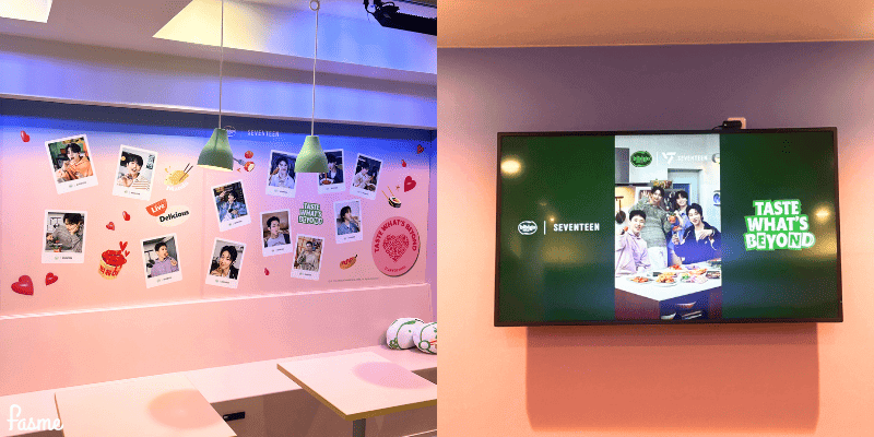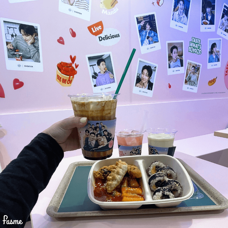 座席にはキャラクタークッション、壁にはSEVENTEENメンバーのフォトやムービーがずらり。まるで“推しと一緒に食事している”ような空間に、思わず長居したくなっちゃう♡