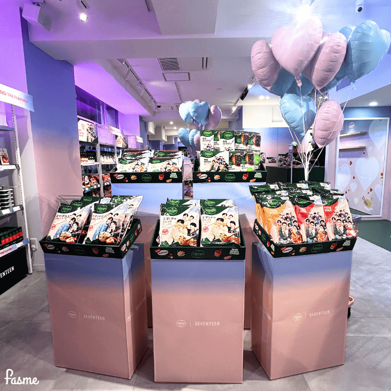SEVENTEENの新ビジュアルを使った限定パッケージがずらりと並び、訪れた人だけが間近でチェックできる特別な展示です♡