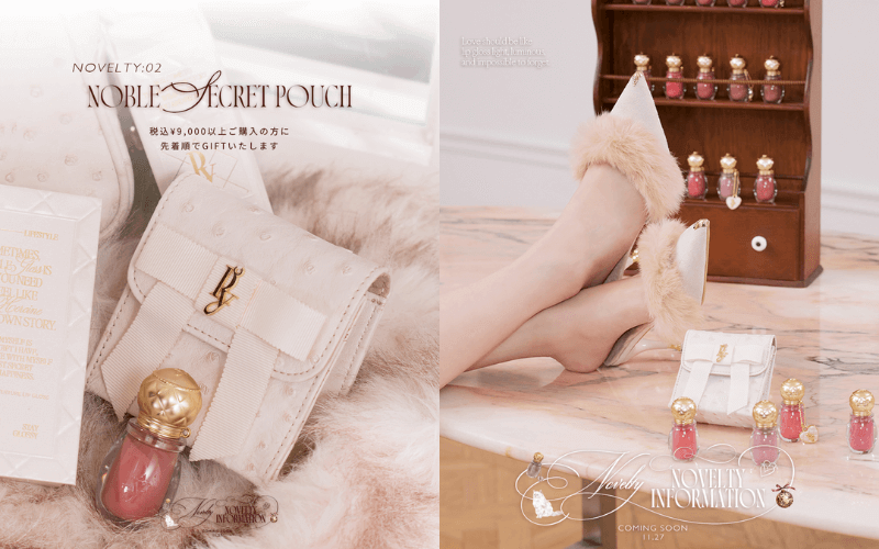 どちらも初回購入分のみのノベルティで、¥9,000以上のお買い上げでリボンポーチをギフトとしてGETできちゃいます。チャームは無くなり次第、別売りに切り替わるのでお早めにチェックを!