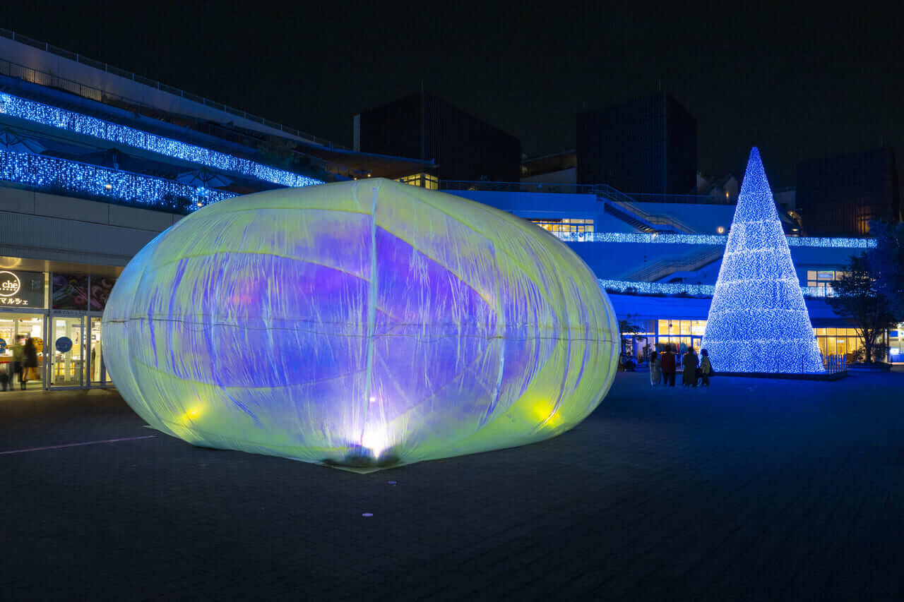 昼間は実際に作品の中に入って体験ができ、夜は幻想的なライトアップが楽しめます。入場は無料で予約不要なので、ぜひ立ち寄ってみて。