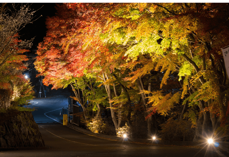 昼は太陽の光で透ける赤い葉、夜はライトに照らされた鮮やかな紅葉と、昼夜で全く違う表情を楽しめます。期間中は温泉街全体も秋色に染まり、ロマンチックな夜のお散歩にぴったりです。
