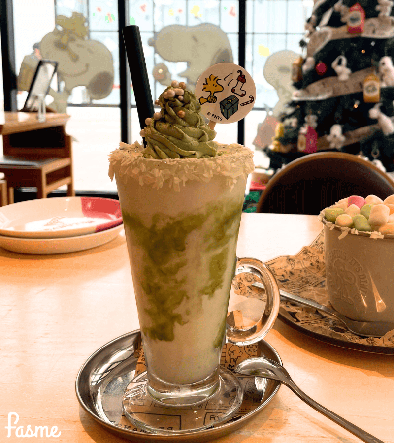 抹茶×ホワイトチョコの濃厚ミルクセーキに、たっぷりホイップでツリー感を演出♡ ウッドストックと一緒に、コミックの世界に浸れる冬限定ドリンクです♪