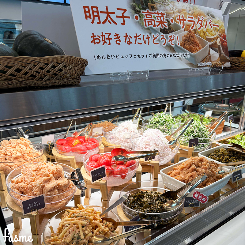 ランチタイム(11:00〜15:00)限定の「めんたいビュッフェ付きセットメニュー」では、できたての明太子をはじめ、ごはん、お味噌汁、高菜やサラダ、お惣菜がすべて食べ放題!