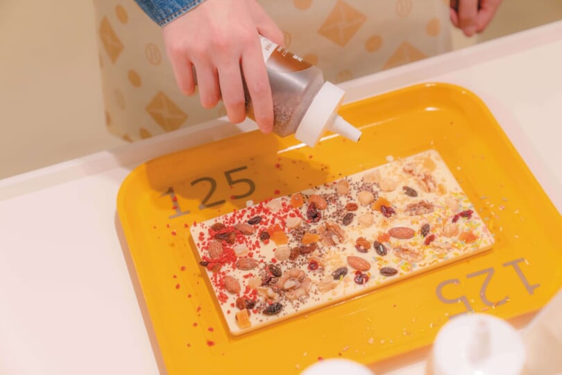 ในโซนเสียเงิน Chocolate Workshop คุณสามารถตกแต่งช็อกโกแลตแท่งขนาดประมาณ 23x12 ซม. ด้วยถั่วหรือผลไม้แห้ง ทำช็อกโกแลตสุดพิเศษในแบบของคุณเอง♡